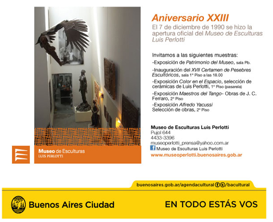 El Museo de Esculturas Luis Perlotti, Pujol 644, cumple 23 años el día 7 de diciembre. Por tal motivo invita a las muestras: