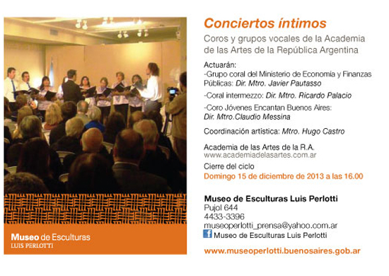 El domingo 15 de diciembre, a las 16 hs, en el Museo de Esculturas Luis Perlotti, Pujol 644, se llevará a cabo un nuevo encuentro de su Ciclo «Conciertos Intimos» con la participación de diferentes Coros y Grupos Vocales.