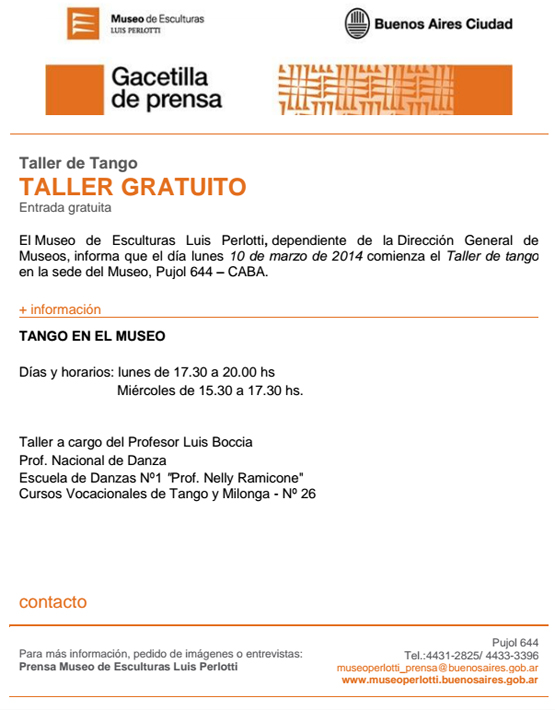 El Museo de Esculturas Luis Perlotti, Pujol 644, informa que está abierta la inscripción para sus cursos de Tango. Más datos a continuación: