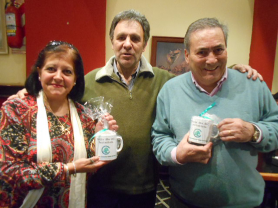 Marina y Arnaldo recibiendo un presente de Sergio Mosquera de la Asociación Vecinos del Parque Centenario