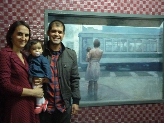 Dario Zana, autor de los murales, junto a su esposa, Ana Laura y su hija Helena, ambas pintadas de espaldas en el mural.