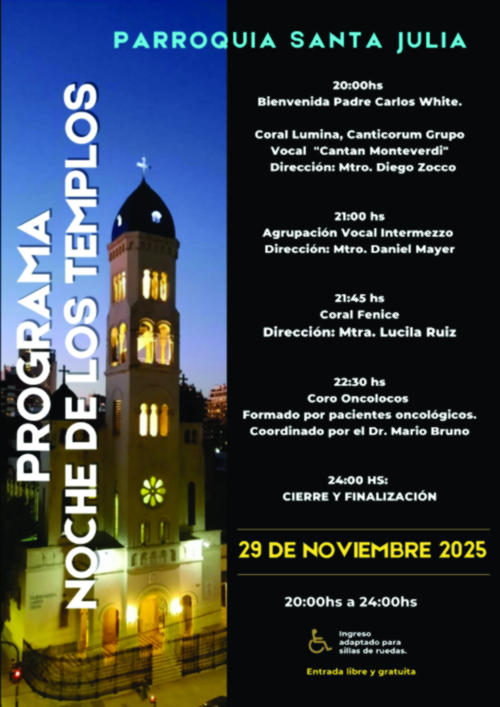 La Parroquia Santa Julia, ubicada en Juan Bautista Alberdi y Víctor Martínez, invita a participar en las diferentes actividades que tendrán lugar con motivo de una nueva edición de La Noche de los Templos.